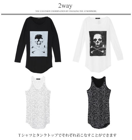 ボックスフレームの中にスカルフォトプリントが入ったTシャツと モノトーンで構成された総柄プリントのタンクトップによる2Pセットです。